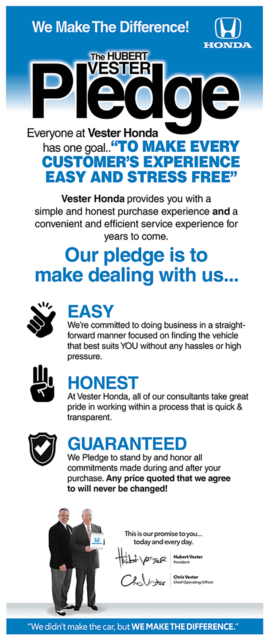 If you have any questions about our services, warranties, or vehicle options, please don’t hesitate to contact us. Our team at Hubert Vester Honda is always here to help you every step of the way.