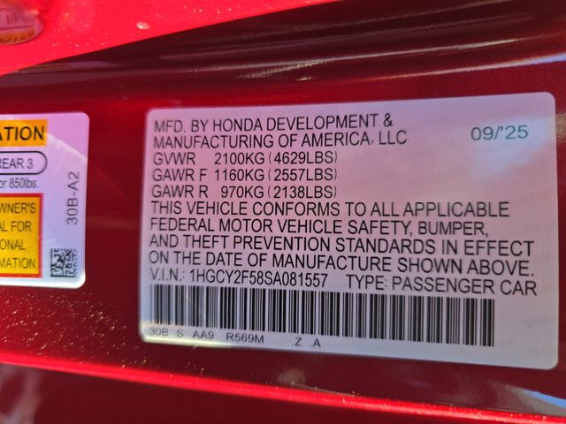 2.0L I4 DOHC 16V, 4-Wheel Disc Brakes, 8 Speakers, ABS brakes, Adaptive Cruise Control: Adaptive Cruise Control (ACC) with Low-Speed Follow, Air Conditioning, Alloy wheels, AM/FM radio, Apple CarPlay/Android Auto, Auto High-beam Headlights, Automatic temperature control, Blind Spot Information (BSI) System warning, Brake assist, Bumpers: body-color, Compass, Delay-off headlights, Driver door bin, Driver vanity mirror, Dual front impact airbags, Dual front side impact airbags, Electronic Stability Control, Emergency communication system: HondaLink, Exterior Parking Camera Rear, Fabric Seat Trim, Four wheel independent suspension, Front anti-roll bar, Front Bucket Seats, Front Center Armrest, Front dual zone A/C, Front reading lights, Fully automatic headlights, Heated Front Bucket Seats, Heated front seats, Illuminated entry, Knee airbag, Lane departure: Lane Keeping Assist System (LKAS) active, Leather Shift Knob, Leather steering wheel, Low tire pressure warning, Occupant sensing airbag, Outside temperature display, Overhead airbag, Overhead console, Panic alarm, Passenger door bin, Passenger vanity mirror, Power door mirrors, Power driver seat, Power moonroof, Power steering, Power windows, Radio data system, Radio: 180-Watt Audio System, Rear anti-roll bar, Rear reading lights, Rear seat center armrest, Rear side impact airbag, Rear window defroster, Remote keyless entry, Security system, Speed control, Speed-sensing steering, Speed-Sensitive Wipers, Split folding rear seat, Spoiler, Steering wheel mounted audio controls, Telescoping steering wheel, Tilt steering wheel, Traction control, Trip computer, Variably intermittent wipers, Wheels: 19" x 8.5J Berlina Black, 2.0L I4 DOHC 16V.