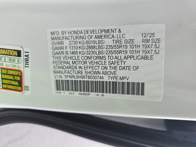 11 Speakers, 3rd row seats: split-bench, 4-Wheel Disc Brakes, ABS brakes, Adaptive Cruise Control: Adaptive Cruise Control (ACC) with Low-Speed Follow, Air Conditioning, Alloy wheels, AM/FM radio: SiriusXM, Anti-whiplash front head restraints, Apple CarPlay/Android Auto, Auto High-beam Headlights, Auto-dimming door mirrors, Auto-dimming Rear-View mirror, Automatic temperature control, Blind Spot Information (BSI) System warning, Brake assist, Bumpers: body-color, Compass, Delay-off headlights, Driver door bin, Driver vanity mirror, Driver's Seat Mounted Armrest, Dual front impact airbags, Dual front side impact airbags, Electronic Stability Control, Emergency communication system: HondaLink, Exterior Parking Camera Rear, Four wheel independent suspension, Front anti-roll bar, Front Bucket Seats, Front dual zone A/C, Front fog lights, Front reading lights, Fully automatic headlights, Garage door transmitter: HomeLink, Heated & Ventilated Front Bucket Seats, Heated door mirrors, Heated front seats, Heated steering wheel, Illuminated entry, Knee airbag, Lane departure: Lane Keeping Assist System (LKAS) active, Leather steering wheel, Low tire pressure warning, Memory seat, Navigation system: Honda Satellite-Linked Navigation System, Occupant sensing airbag, Outside temperature display, Overhead airbag, Overhead console, Panic alarm, Passenger door bin, Passenger seat mounted armrest, Passenger vanity mirror, Perforated Leather-Trimmed Seats w/Piping, Power door mirrors, Power driver seat, Power Liftgate, Power moonroof, Power passenger seat, Power steering, Power windows, Radio data system, Radio: 500-Watt AM/FM/HD Premium Audio System, Rain sensing wipers, Rear air conditioning, Rear anti-roll bar, Rear audio controls, Rear reading lights, Rear seat center armrest, Rear window defroster, Rear window wiper, Reclining 3rd row seat, Remote keyless entry, Security system, Speed control, Speed-sensing steering, Speed-Sensitive Wipers, Split folding rear seat, Spoiler, Steering wheel mounted audio controls, Tachometer, Telescoping steering wheel, Tilt steering wheel, Traction control, Trip computer, Turn signal indicator mirrors, Variably intermittent wipers, Ventilated front seats, Wheels: 19" Machine-Finished Alloy.
