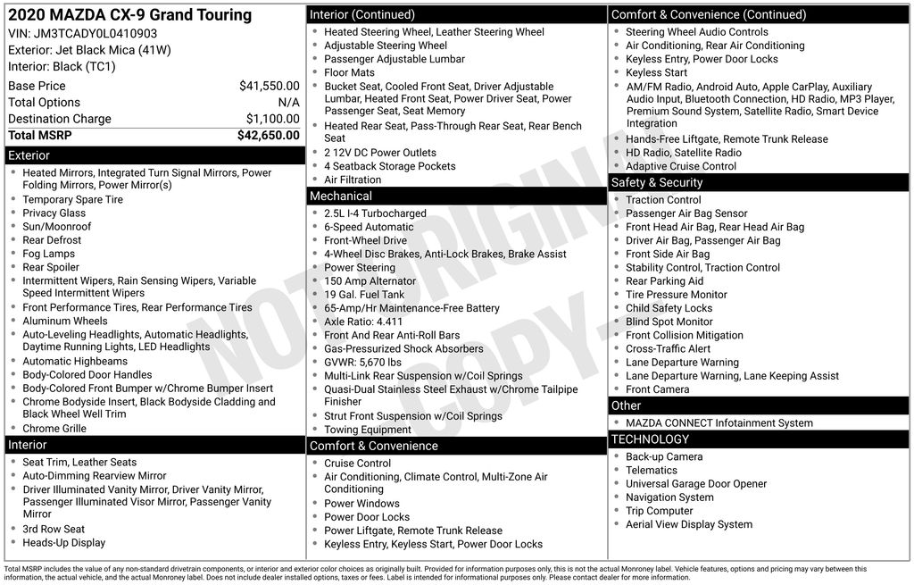 Jet Black Mica 2020 Mazda CX-9 Grand Touring 4D Sport Utility FWD 2.5L 4-Cylinder 6-Speed Automatic