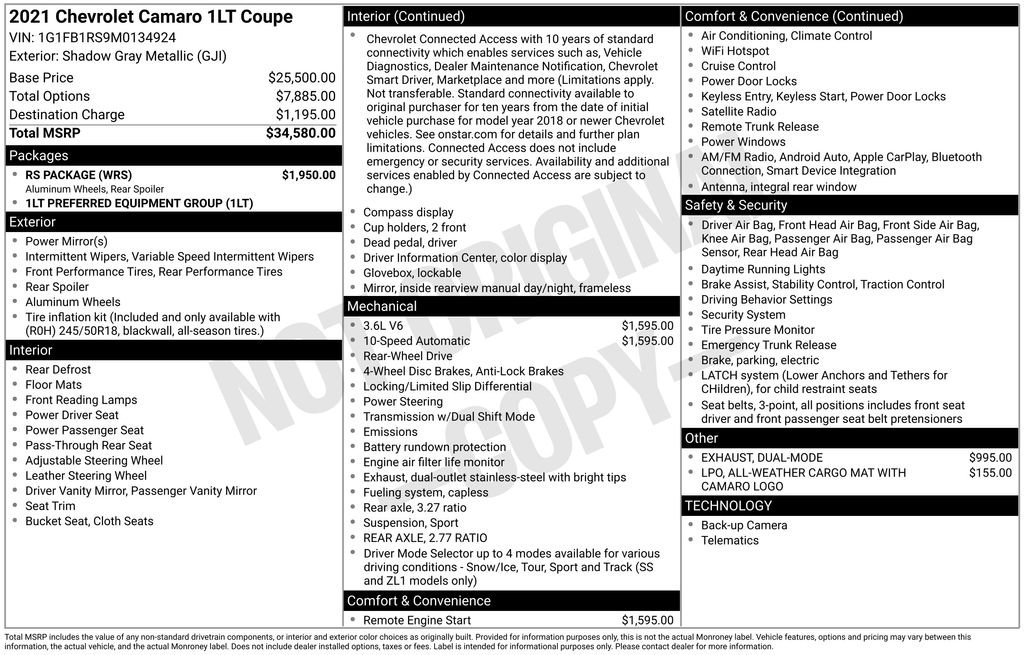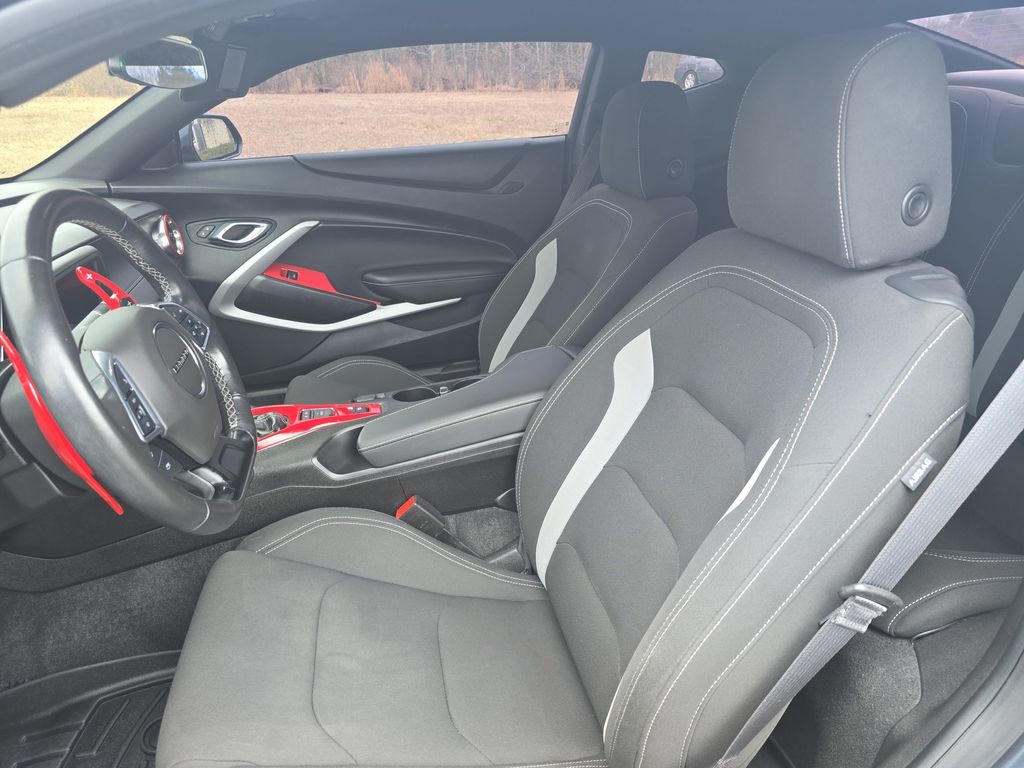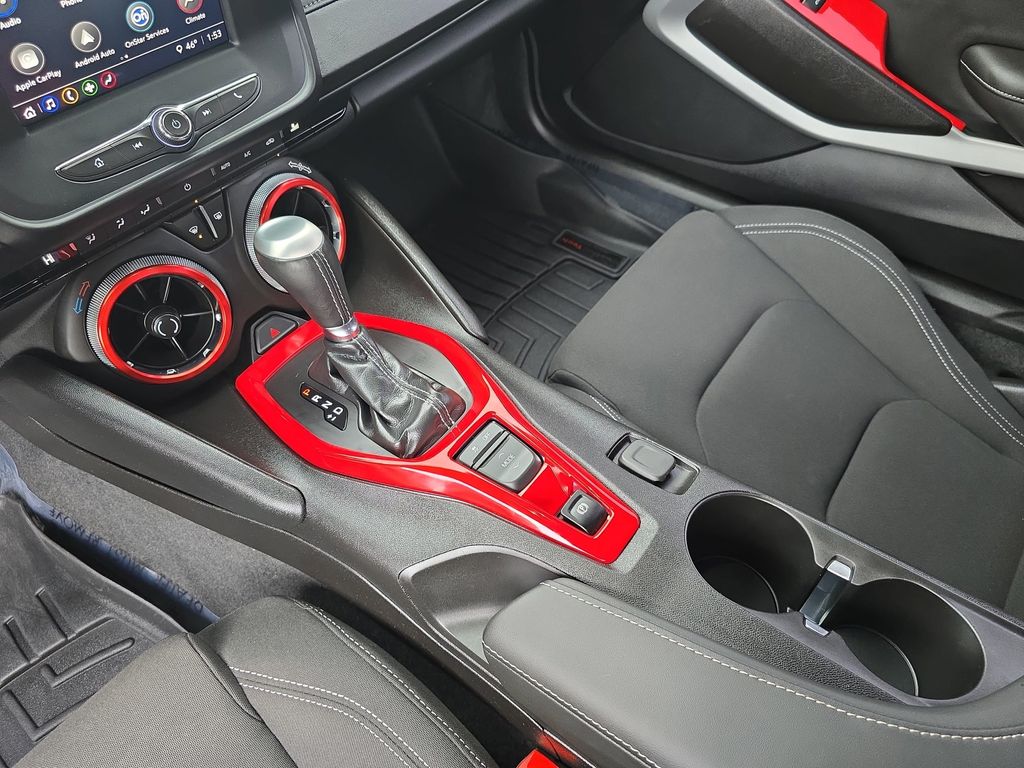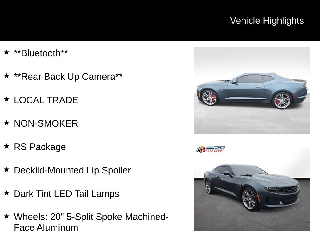 **Bluetooth**, **Rear Back Up Camera**, LOCAL TRADE, NON-SMOKER, Vester Certified Pre-Owned Certified, Dark Tint LED Tail Lamps, Decklid-Mounted Lip Spoiler, RS Package, Wheels: 20" 5-Split Spoke Machined-Face Aluminum, 18" Silver-Painted Aluminum Wheels, 2.77 Rear Axle Ratio, 4-Wheel Disc Brakes, 6 Speakers, 6-Speaker Audio System Feature, 6-Way Power Front Passenger Seat Adjuster, 8-Way Power Driver Seat Adjuster, ABS brakes, Air Conditioning, All-Weather Cargo Mat w/Camaro Logo (LPO), Alloy wheels, AM/FM radio: SiriusXM, Apple CarPlay/Android Auto, Automatic temperature control, Bluetooth® For Phone, Brake assist, Bumpers: body-color, Cloth Seat Trim, Compass, Delay-off headlights, Driver door bin, Driver vanity mirror, Dual front impact airbags, Dual front side impact airbags, Dual Mode Exhaust, Electronic Stability Control, Exterior Parking Camera Rear, Four wheel independent suspension, Front anti-roll bar, Front Bucket Seats, Front Center Armrest, Front reading lights, Front Sport Bucket Seats, Fully automatic headlights, Illuminated entry, Knee airbag, Leather Shift Knob, Low tire pressure warning, Occupant sensing airbag, Overhead airbag, Paddle-Shift Manual Controls, Panic alarm, Passenger door bin, Passenger vanity mirror, Power door mirrors, Power driver seat, Power passenger seat, Power steering, Power windows, Preferred Equipment Group 1LT, Premium audio system: Chevrolet Infotainment System, Radio data system, Radio: Chevrolet Infotainment 3 System, Rear anti-roll bar, Rear window defroster, Remote keyless entry, Remote Vehicle Starter System, Security system, SiriusXM Radio, Speed control, Speed-sensing steering, Steering wheel mounted audio controls, Tachometer, Telescoping steering wheel, Tilt steering wheel, Tire Inflation Kit, Traction control, Trip computer, Variably intermittent wipers, Voltmeter, Dark Tint LED Tail Lamps, Decklid-Mounted Lip Spoiler, RS Package, Wheels: 20" 5-Split Spoke Machined-Face Aluminum.