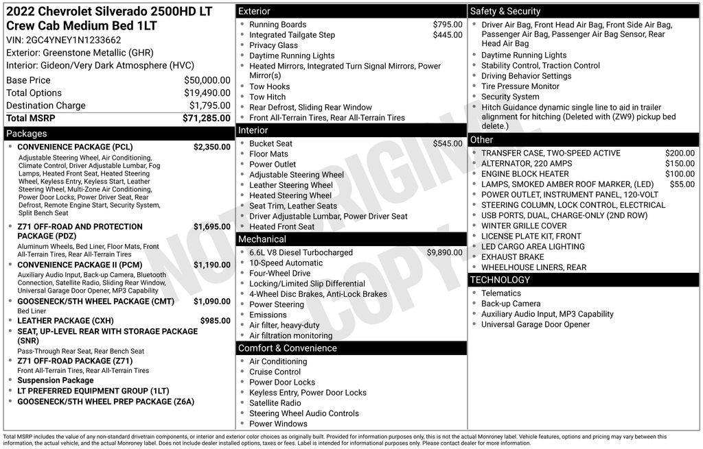 10-Speed Automatic, 4WD, Gideon/Very Dark Atmosphere Leather, 10-Way Power Driver Seat Adjuster w/Lumbar, 12-Volt Rear Auxiliary Power Outlet, 120-Volt Bed Mounted Power Outlet, 120-Volt Instrument Panel Power Outlet, 17" Machined Aluminum Wheels, 170 Amp Alternator, 1st & 2nd Row All-Weather Floor Liners (LPO) (AAK), 2 USB Ports (1st Row), 2 USB Ports & 1 SD Card Reader (1st Row), 2-Speed Active Electronic AutoTrac Transfer Case, 2-Speed Electronic Shift Transfer Case, 220 Amp Alternator, 4-Way Manual Driver Seat Adjuster, 4-Wheel Disc Brakes, 4.2" Diagonal Color Display Driver Info Center, 6 Speakers, 6-Speaker Audio System, 6" Rectangular Chromed Tubular Assist Steps, 720 Cold-Cranking Amps Heavy-Duty Battery, ABS brakes, Advanced Trailering System, Air Conditioning, Alloy wheels, AM/FM radio: SiriusXM, Apple CarPlay/Android Auto, Black Chevytec Spray-On Bedliner w/Chevrolet Logo, Black Mirror Caps, Bluetooth® For Phone, Brake assist, Bumpers: chrome, Chevrolet Connected Access Capable, Chrome Front Grille, Cloth Rear Seat w/Storage Package (DISC), Cloth Seat Trim, Color-Keyed Carpeting Floor Covering, Compass, Convenience Package, Convenience Package II, Deep-Tinted Glass, Delay-off headlights, Driver door bin, Driver vanity mirror, Dual Charge-Only USB Ports (2nd Row), Dual front impact airbags, Dual front side impact airbags, Dual-Zone Automatic Climate Control, Electric Rear-Window Defogger, Electrical Lock Control Steering Column, Electronic Cruise Control w/Set & Resume Speed, Electronic Stability Control, Engine Block Heater, Exhaust Brake, EZ Lift Power Lock & Release Tailgate, Floor-Mounted Center Console, Front 40/20/40 Split-Bench Seats, Front 40/20/40 Split-Bench Seats w/Lockable Storage, Front anti-roll bar, Front Bucket Seats, Front Center Armrest w/Storage, Front LED Fog Lamps, Front License Plate Kit, Front reading lights, Front Rubberized Vinyl Floor Mats, Front wheel independent suspension, Fully automatic headlights, Gooseneck/5th Wheel Package, Gooseneck/5th Wheel Prep Package, Halogen Reflector Headlamps, HD Rear Vision Camera, Heated door mirrors, Heated Driver & Front Outboard Passenger Seating, Heated Steering Wheel, Heated Vertical Trailering Mirrors, Hill Descent Control, Hitch Guidance w/Hitch View, Illuminated entry, Integrated Trailer Brake Controller, Keyless Open & Start, Leather Package, Leather-Wrapped Steering Wheel, LED Cargo Area Lighting, LED Smoked Amber Roof Marker Lamps, Low tire pressure warning, Manual Tilt & Telescoping Steering Column, Manual Tilt-Wheel Steering Column, Multi-Flex Tailgate, Occupant sensing airbag, Off-Road Suspension, OnStar & Chevrolet Connected Services Capable, Outside temperature display, Overhead airbag, Overhead console, Panic alarm, Passenger door bin, Passenger vanity mirror, Power Door Locks, Power door mirrors, Power Front Windows w/Driver Express Up/Down, Power Front Windows w/Passenger Express Down, Power Rear Windows w/Express Down, Power Sliding Rear Window w/Defogger, Power steering, Power windows, Preferred Equipment Group 1LT, Premium audio system: Chevrolet Infotainment 3, Radio: Chevrolet Infotainment 3 Plus System, Radio: Chevrolet Infotainment 3 System, Rear 60/40 Folding Bench Seat (Folds Up), Rear reading lights, Rear Rubberized Vinyl Floor Mats, Rear step bumper, Rear Vision Camera, Rear Wheelhouse Liners, Remote Keyless Entry, Remote keyless entry, Remote Vehicle Starter System, SiriusXM Radio, SiriusXM w/360L, Speed control, Split folding rear seat, Standard Tailgate, Steering Wheel Audio Controls, Steering wheel mounted audio controls, Suspension Package, Tachometer, Tilt steering wheel, Traction control, Trip computer, Turn signal indicator mirrors, Unauthorized Entry Theft-Deterrent System, Universal Home Remote, Up-Level Rear Seat w/Storage Package, Urethane Steering
