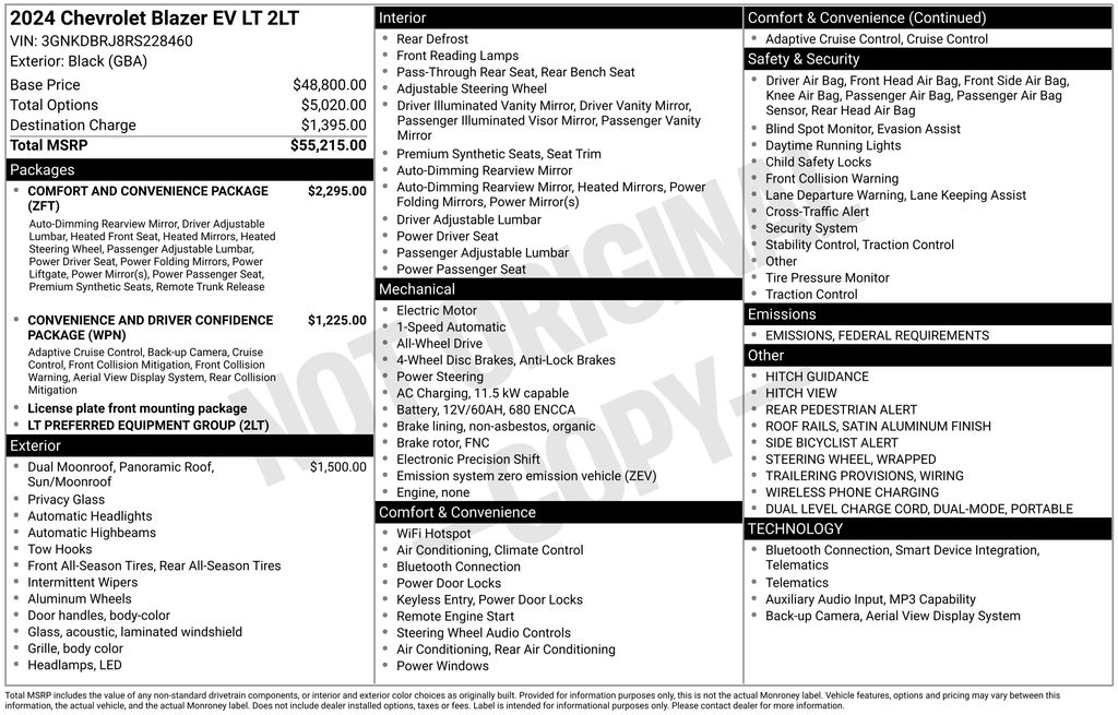 11.1 Axle Ratio, 2-Way Power Driver Lumbar Seat Adjuster, 2-Way Power Passenger Lumbar Seat Adjuster, 4-Wheel Disc Brakes, 6 Speakers, 6-Speaker Audio System Feature, 6-Way Power Passenger Seat Adjuster, 8-Way Power Driver Seat Adjuster, ABS brakes, Adaptive Cruise Control, Air Conditioning, Alloy wheels, AM/FM radio: SiriusXM with 360L, Auto High-beam Headlights, Automatic temperature control, Brake assist, Bumpers: body-color, Comfort & Convenience Package, Compass, Convenience & Driver Confidence Package, Delay-off headlights, Driver door bin, Driver vanity mirror, Dual front impact airbags, Dual front side impact airbags, Electronic Stability Control, Emergency communication system: OnStar and Chevrolet connected services capable, Enhanced Automatic Emergency Braking, Evotex Seat Trim, Four wheel independent suspension, Front anti-roll bar, Front Bucket Seats, Front Center Armrest, Front reading lights, Fully automatic headlights, HD Surround Vision, Heated Driver & Fr Passenger Seats Cushion & Seatback, Heated Steering Wheel, Hitch Guidance, Hitch View, Illuminated entry, Inside Rear-View Auto-Dimming Mirror, Intersection Automatic Emergency Braking, Knee airbag, Low tire pressure warning, Navigation System, Occupant sensing airbag, Outside temperature display, Overhead airbag, Overhead console, Panic alarm, Passenger door bin, Passenger vanity mirror, Power door mirrors, Power Dual Panel Panoramic Sliding Sunroof, Power steering, Power windows, Power-Adjustable Power-Folding Heated Mirrors, Preferred Equipment Group 2LT, Programmable Hands Free AutoSense Power Liftgate, Radio: 17.7" Diagonal Advanced Color LCD Display, Rear anti-roll bar, Rear Pedestrian Alert, Rear reading lights, Rear seat center armrest, Rear window defroster, Rear window wiper, Remote keyless entry, Reverse Automatic Braking, Ride & Handling Suspension, Satin Aluminum Finish Roof Rails, Security system, Side Bicyclist Alert, SiriusXM w/360L, Speed control, Split folding rear seat, Spoiler, Steering wheel mounted audio controls, Telescoping steering wheel, Tilt steering wheel, Traction control, Trip computer, Variably intermittent wipers, Wheels: 19" Machined-Face Aluminum w/Painted Pockets, Wireless Phone Charging, Wrapped Steering Wheel.