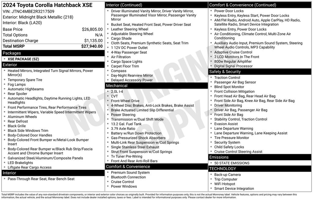 Certified!, Local Trade!, Carfax One Owner!!!, Clean Carfax!!!, Back Up Camera!!, Bluetooth!!, Vester Certified Pre-Owned Certified, 4-Wheel Disc Brakes, 8 Speakers, ABS brakes, Air Conditioning, Alloy wheels, AM/FM radio: SiriusXM, Auto High-beam Headlights, Automatic temperature control, Brake assist, Bumpers: body-color, Compass, Delay-off headlights, Driver door bin, Driver vanity mirror, Dual front impact airbags, Dual front side impact airbags, Electronic Stability Control, Emergency communication system: Safety Connect (up to 10-year trial subscription), Exterior Parking Camera Rear, Fabric/SofTex Seat Trim, Four wheel independent suspension, Front anti-roll bar, Front Bucket Seats, Front Center Armrest, Front dual zone A/C, Front fog lights, Front reading lights, Heated door mirrors, Heated front seats, Heated Sport Front Seats, Illuminated entry, Knee airbag, Leather Shift Knob, Leather steering wheel, Low tire pressure warning, Occupant sensing airbag, Outside temperature display, Overhead airbag, Overhead console, Panic alarm, Passenger door bin, Passenger vanity mirror, Power door mirrors, Power driver seat, Power steering, Power windows, Radio data system, Radio: 8" Toyota Audio Multimedia, Rear anti-roll bar, Rear seat center armrest, Rear side impact airbag, Rear window defroster, Rear window wiper, Remote keyless entry, Security system, Speed control, Speed-sensing steering, Split folding rear seat, Spoiler, Steering wheel mounted audio controls, Tachometer, Telescoping steering wheel, Tilt steering wheel, Traction control, Trip computer, Turn signal indicator mirrors, Variably intermittent wipers, Wheels: 18" Graphite-Colored Alloy.