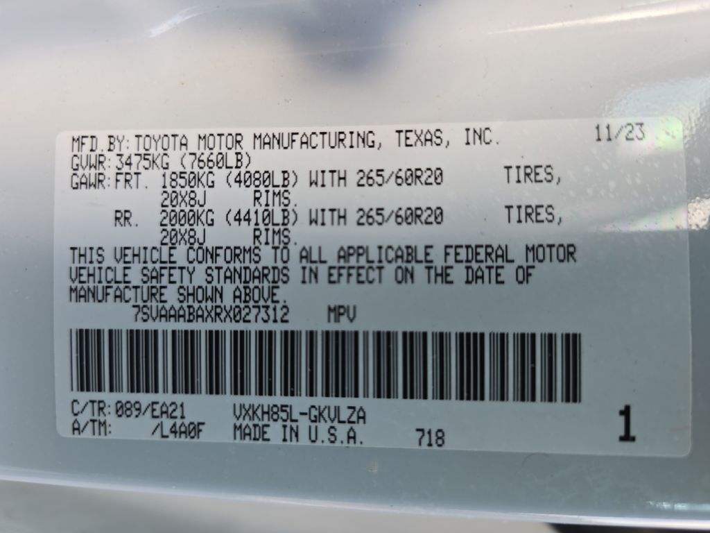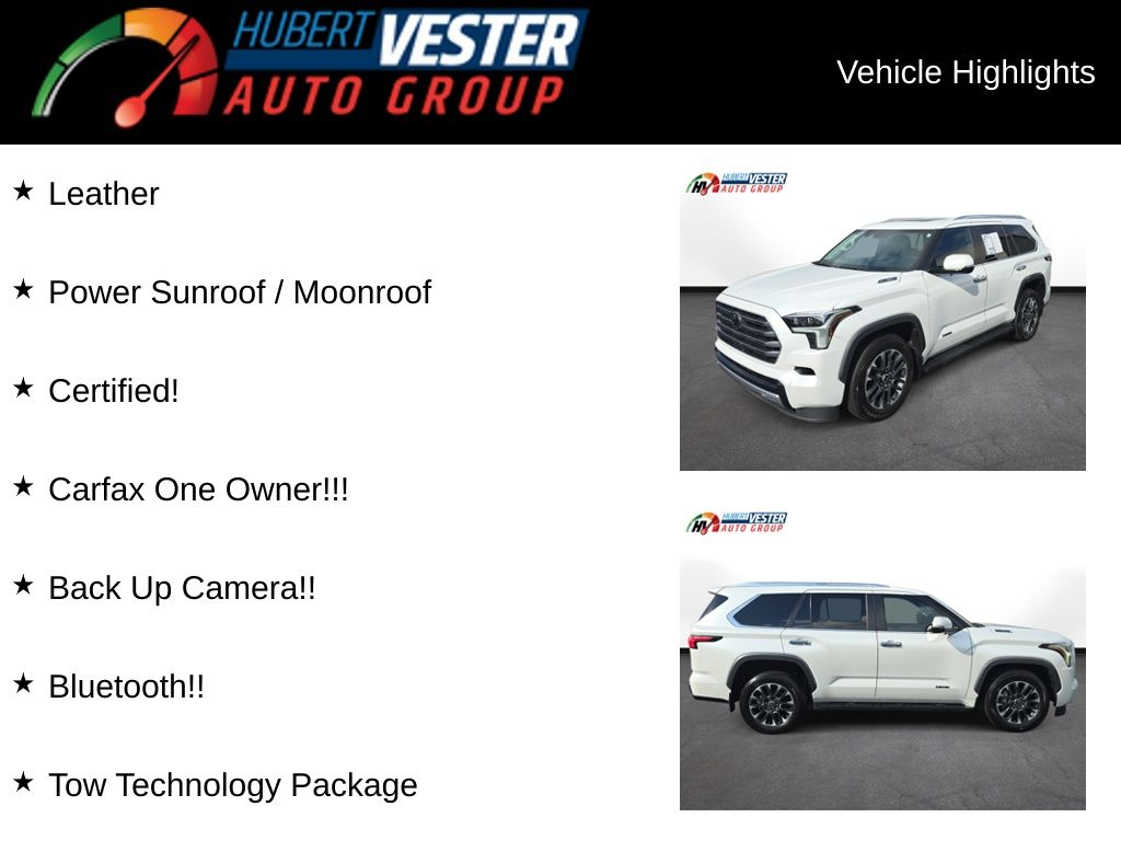 Leather, Power Sunroof / Moonroof, Certified!, Carfax One Owner!!!, Back Up Camera!!, Bluetooth!!, Vester Certified Pre-Owned Certified, V6 Hybrid, 10-Speed Automatic, 4WD, Tow Technology Package, 3.31 Axle Ratio, 3rd row seats: split-bench, 4-Wheel Disc Brakes, 8 Speakers, ABS brakes, Air Conditioning, Alloy wheels, AM/FM radio: SiriusXM, Anti-whiplash front head restraints, Apple CarPlay/Android Auto, Auto High-beam Headlights, Auto-dimming door mirrors, Auto-dimming Rear-View mirror, Automatic temperature control, Brake assist, Bumpers: body-color, Cast Aluminum Step & Step Cover, Delay-off headlights, Driver door bin, Driver vanity mirror, Dual front impact airbags, Dual front side impact airbags, Electronic Stability Control, Emergency communication system: Safety Connect (10-year trial), Exterior Parking Camera Rear, Front anti-roll bar, Front Bucket Seats, Front Center Armrest w/Storage, Front dual zone A/C, Front fog lights, Front reading lights, Front wheel independent suspension, Fully automatic headlights, Garage door transmitter: HomeLink, Headlight cleaning, Heated & Ventilated Front Seats, Heated door mirrors, Heated front seats, Heated steering wheel, Illuminated entry, JBL 14 Speakers, Knee airbag, Leather Shift Knob, Leather steering wheel, Low tire pressure warning, Memory seat, Navigation system: Drive Connect (1 year trial) includes Cloud Navigation with real time traffic and Google POI, Occupant sensing airbag, Outside temperature display, Overhead airbag, Overhead console, Panic alarm, Passenger door bin, Passenger vanity mirror, Power door mirrors, Power driver seat, Power Liftgate, Power moonroof, Power passenger seat, Power steering, Power windows, Radio: Toyota Multimedia w/14" Display, Rear air conditioning, Rear reading lights, Rear seat center armrest, Rear window defroster, Rear window wiper, Reclining 3rd row seat, Remote keyless entry, Security system, SofTex Seat Trim, Speed control, Speed-sensing steering, Split folding rear seat, Spoiler, Steering wheel mounted audio controls, Tachometer, Telescoping steering wheel, Tilt steering wheel, Traction control, Trip computer, Turn signal indicator mirrors, Variably intermittent wipers, Ventilated front seats, Voltmeter, Wheels: 20" Machined-Finish Alloy, Wireless Smartphone Charger, V6 Hybrid, 10-Speed Automatic, 4WD, Tow Technology Package.