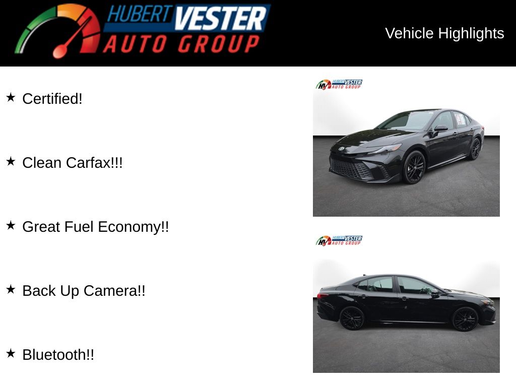Certified!, Clean Carfax!!!, Great Fuel Economy!!, Back Up Camera!!, Bluetooth!!, 2.5L 4-Cylinder 16V DOHC, Black w/SofTex & Fabric Seat Trim, 4-Wheel Disc Brakes, 6 Speakers, ABS brakes, Air Conditioning, Alloy wheels, AM/FM radio: SiriusXM, Apple CarPlay/Android Auto, Auto High-beam Headlights, Automatic temperature control, Brake assist, Bumpers: body-color, Delay-off headlights, Driver door bin, Driver vanity mirror, Dual front impact airbags, Dual front side impact airbags, Electronic Stability Control, Emergency communication system: Safety Connect (up to 10-year trial subscription), Exterior Parking Camera Rear, Four wheel independent suspension, Front anti-roll bar, Front Bucket Seats, Front Center Armrest, Front dual zone A/C, Front reading lights, Fully automatic headlights, Heated door mirrors, Illuminated entry, Knee airbag, Leather Shift Knob, Leather steering wheel, Low tire pressure warning, Occupant sensing airbag, Outside temperature display, Overhead airbag, Overhead console, Panic alarm, Passenger door bin, Passenger vanity mirror, Power door mirrors, Power driver seat, Power steering, Power windows, Preferred Package 1 w/Carpet Mats (TMS), Radio data system, Radio: Toyota Audio Multimedia w/12.3" Touchscreen, Radio: Toyota Audio Multimedia w/8" Touchscreen, Rear anti-roll bar, Rear reading lights, Rear seat center armrest, Rear side impact airbag, Rear window defroster, Remote keyless entry, Security system, SofTex & Fabric Seat Trim, Speed control, Speed-sensing steering, Split folding rear seat, Spoiler, Steering wheel mounted audio controls, Telescoping steering wheel, Tilt steering wheel, Traction control, Trip computer, Turn signal indicator mirrors, Variably intermittent wipers, Wheels: 18" Black-Finished Alloy, 2.5L 4-Cylinder 16V DOHC, Black w/SofTex & Fabric Seat Trim.