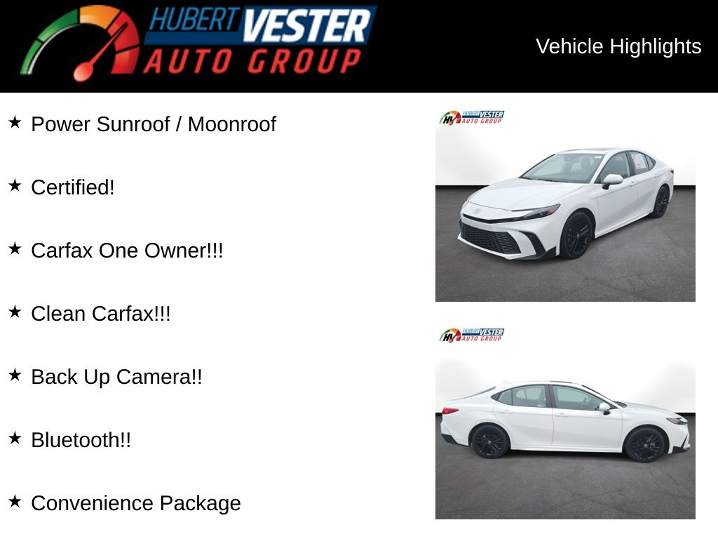 Power Sunroof / Moonroof, Certified!, Carfax One Owner!!!, Clean Carfax!!!, Back Up Camera!!, Bluetooth!!, Vester Certified Pre-Owned Certified, 2.5L 4-Cylinder 16V DOHC, Black w/SofTex and Fabric Seat Trim, Convenience Package, 4-Wheel Disc Brakes, 6 Speakers, ABS brakes, Air Conditioning, Alloy wheels, AM/FM radio: SiriusXM, Apple CarPlay/Android Auto, Auto High-beam Headlights, Automatic temperature control, Brake assist, Bumpers: body-color, Delay-off headlights, Driver door bin, Driver vanity mirror, Dual front impact airbags, Dual front side impact airbags, Electronic Stability Control, Emergency communication system: Safety Connect (up to 10-year trial subscription), Exterior Parking Camera Rear, Four wheel independent suspension, Front anti-roll bar, Front Bucket Seats, Front Center Armrest, Front dual zone A/C, Front reading lights, Fully automatic headlights, Heated door mirrors, Illuminated entry, Knee airbag, Leather Shift Knob, Leather steering wheel, Low tire pressure warning, Occupant sensing airbag, Outside temperature display, Overhead airbag, Overhead console, Panic alarm, Passenger door bin, Passenger vanity mirror, Power door mirrors, Power driver seat, Power steering, Power windows, Radio data system, Radio: Toyota Audio Multimedia w/12.3" Touchscreen, Radio: Toyota Audio Multimedia w/8" Touchscreen, Rear anti-roll bar, Rear reading lights, Rear seat center armrest, Rear side impact airbag, Rear window defroster, Remote keyless entry, Security system, SofTex & Fabric Seat Trim, Speed control, Speed-sensing steering, Split folding rear seat, Spoiler, Steering wheel mounted audio controls, Telescoping steering wheel, Tilt steering wheel, Traction control, Trip computer, Turn signal indicator mirrors, Variably intermittent wipers, Wheels: 18" Black-Finished Alloy, 2.5L 4-Cylinder 16V DOHC, Black w/SofTex and Fabric Seat Trim, Convenience Package.